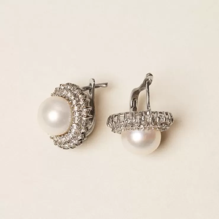 These Elegant Earrings Have A Freshwater Pearl At Their Centre, Delicately Surrounded By Sparkling Crystals.925 Silver Plated Posts.2.2 X 2.3 Cm.