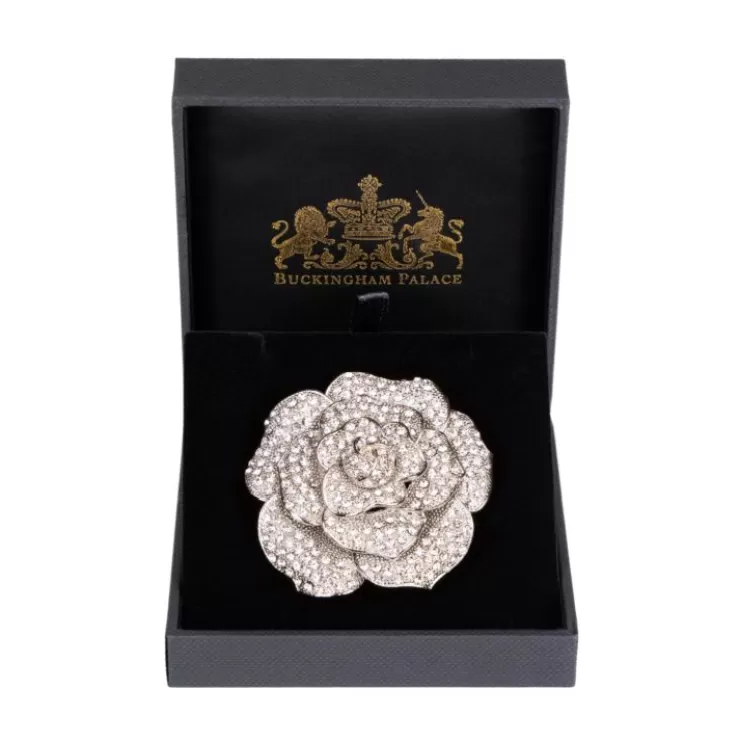 This Elegant Rose Brooch Is Inspired By The Beautiful Flowers Which Bloom In The Gardens Of The Royal Residences. They Are Adorned With Sparkling Crystals Which Are Set Into A White Gold-Plated Metal.