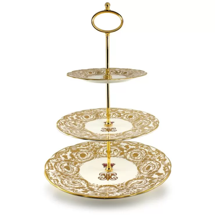 An Intricate And Ornate Design Decorates All Three Tiers Of This Exquisite Cake Stand. The 22 Carat Gold Beautiful Pattern Is Interlaced Foliate Scrolls, Shamrocks, Thistles And Rose Sprays And Is Inspired By The Worcester Plate Made In 1840 And Belonging To The Royal Collection. At The Centre Of Each Tier Is The Cipher Of Queen Victoria And Prince Albert Which Is Surmounted By The Royal Crown.